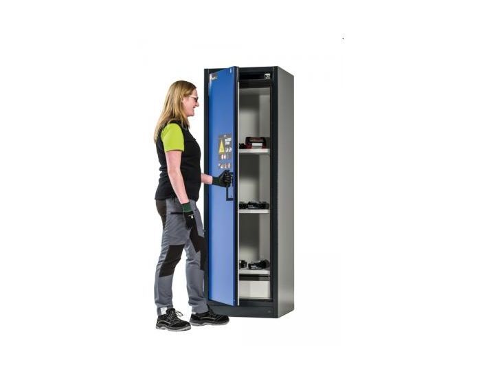 These blue color-coded, flame-resistant battery safety cabinets are equipped with adjustable shelves, allowing you to reconfigure the space to safely store your materials. The 90-minute premium safety cabinets are specifically designed to protect lithium-ion batteries from physical damage, such as banging, during storage, which is a key feature when using fire-resistant battery storage solutions. Each cabinet includes a “Hazardous – Keep Fire Away” label and a pack of ten application-specific labels to customize and indicate the cabinet’s contents.